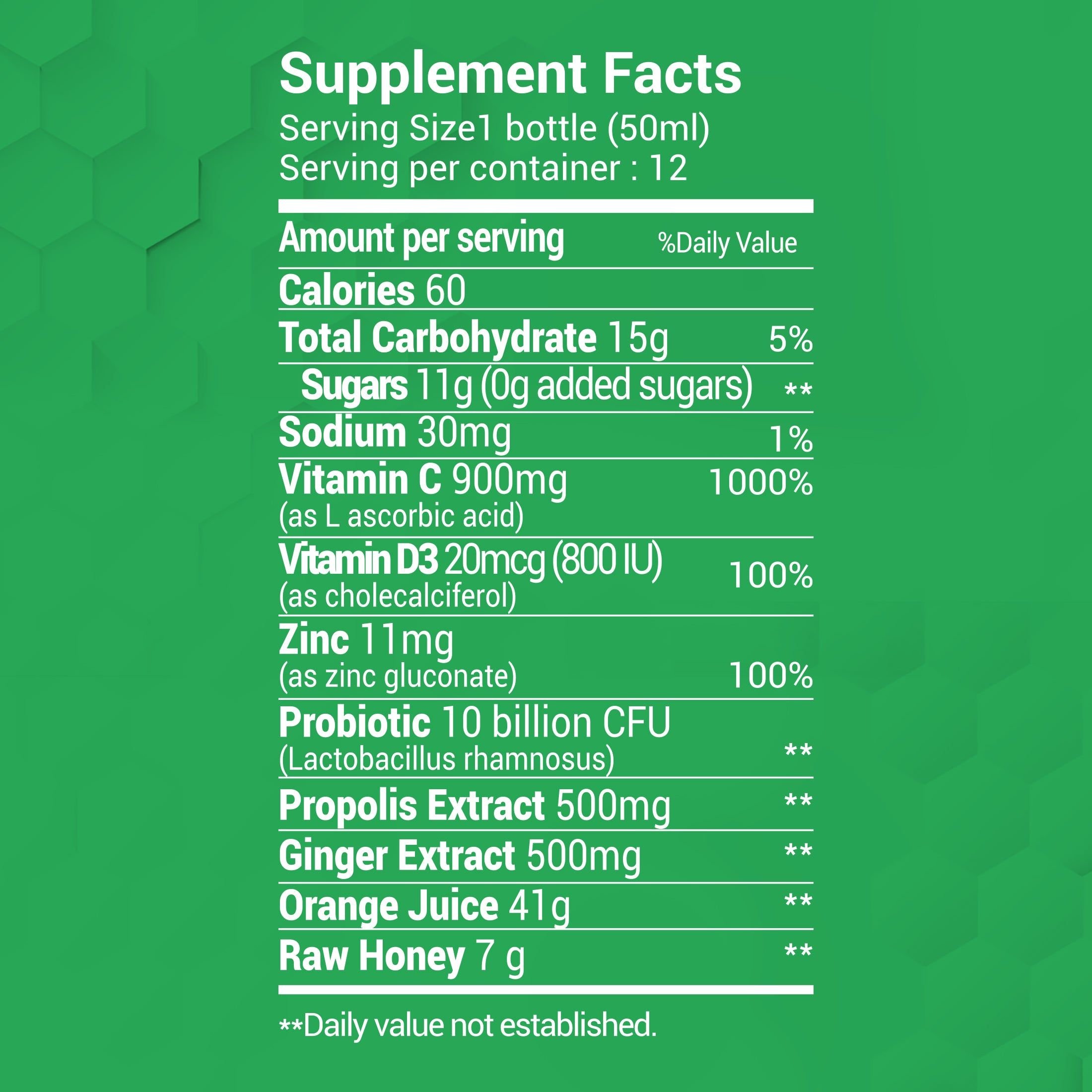 Specially formulated with Anatolian propolis (A.P.E), Vitamin D3, Probiotic 10 billion CFU (Lactobacillus rhamnosus),Ginger, Vitamin C, and zinc.