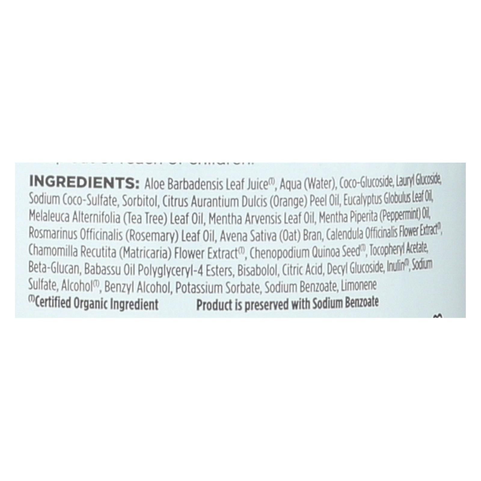 ingredients : aloe barbadensis leaf juice;¹;aqua;water;coco-glucoside;lauryl glucoside;sodium coco-sulfate;sorbitol;citrus aurantium dulcis;orange;peel oil;eucalyptus globulus leaf oil;melaleuca alternifolia;tea tree;leaf oil;mentha arvensis leaf oil;mentha piperita;peppermint;oil;rosmarinus officinalis;rosemary;avena sativa;oat;bran;calendula officinalis flower extract;chamomilla recutita;matricaria;flower extract;chenopodium quinoa seed;tocopheryl acetate;beta-glucan;babassu oil polyglyceryl-4 esters;bisabo