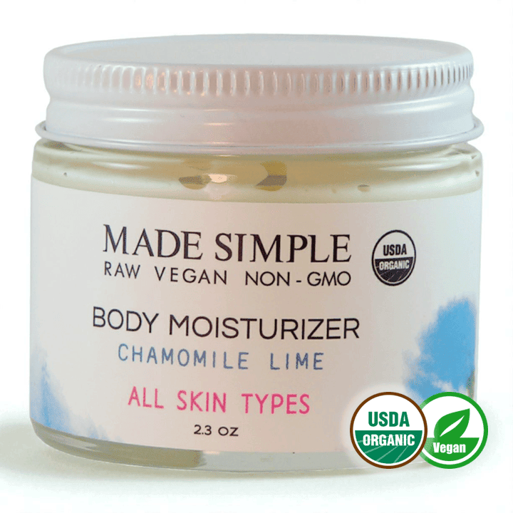 Our 100% natural, USDA certified organic, vegan, cruelty-free Chamomile Lime moisturizer is designed and whipped to replenish and hydrate your skin while improving its texture and appearance with only 100% all-natural antibacterial plant-based sustainably sourced ingredients. This much-loved moisturizer is based in Shea Butter, Coconut Oil, Almond Oil, and Jojoba Oil. Shea Butter and Coconut Oil are known to reduce stretch marks and promote collagen production. Almond Oil soothes skin irritations like eczema and Jojoba Oil reduces dryness and flakiness.