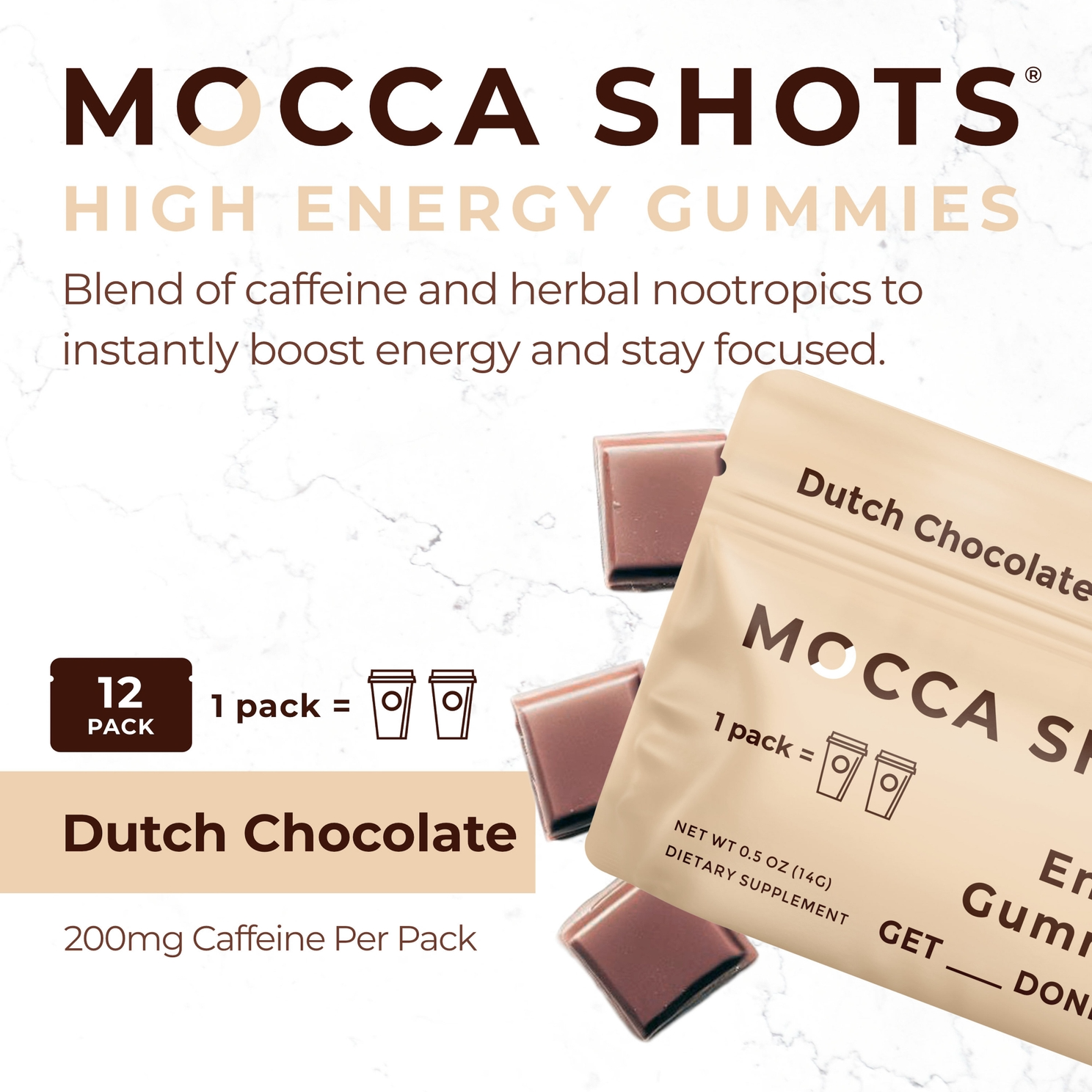 Fast-Acting Energy Without Caffeine Jitters – An Energy Boost You Can Carry in Your Pocket With 200 mg caffeine per pack, our gummies contain as much caffeine as 2 cups of coffee! These tasty chews absorb within minutes so you won’t miss a beat. Our all-natural blend of caffeine and herbal nootropics boosts energy without jittery side-effects so you can focus fast and GET ____ DONE! Mocca Shots High Energy Gummies work 3x faster than coffee at half the price. A unique combination of caffeine, vitamin Bs, and herbal nootropics helps boost energy, improve focus, and enhance cognitive performance without jittery side effects, so you can GET____DONE, anytime, anywhere. Other caffeinated products, like coffee and tablets, take 45 minutes to digest. However, the caffeine in Mocca Shots dissolves and absorbs quickly through the tissues of the mouth (mucosal delivery) allowing you to feel the full caffeine kick within minutes!