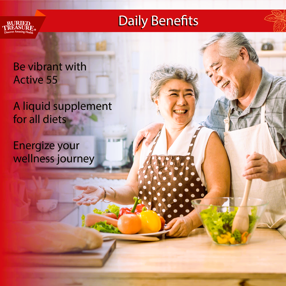 Buried Treasures Active 55 Plus is a premium liquid multi-vitamin and mineral supplement meticulously designed to meet the unique nutritional needs of adults over 55. This comprehensive formula combines essential vitamins, minerals, fulvic minerals, superfoods, and herbs to support overall health and vitality. Each serving delivers a robust blend of nutrients, including Vitamin A, C, D, E, and a complete B-complex, to ensure optimal health. The inclusion of 70+ fulvic acid minerals, supported by studies, enhances nutrient absorption, while a super food blend featuring beets, bilberry, blueberry, pomegranate, barley grass, spinach, and more provides antioxidant defense and supports energy levels. Our formula supports bone and heart health with Calcium, Magnesium, Zinc, and Vitamin D, and supports the immune system with Vitamin C, Selenium, and Zinc. Your brain is fueled by Ginkgo Biloba, Grape Seed Extract, and Bilberry Extract, traditionally used to protect against free radicals. This easy-to-digest liquid supplement supports nutrient absorption, making it more effective than traditional pills or capsules. With additional ingredients like MSM, Inositol, Paba, Citrus Bioflavonoids, Choline Bitartrate, Rutin, Alpha Lipoic Acid, Boron, L-Glutathione, and Lycopene, Buried Treasures Active 55 Plus offers a comprehensive approach to senior health. Simply take 2 tablespoons (30 ml) daily, which can be mixed with water or juice for convenience. With Buried Treasures Active 55 Plus, you can confidently support your overall health and well-being as you age.
