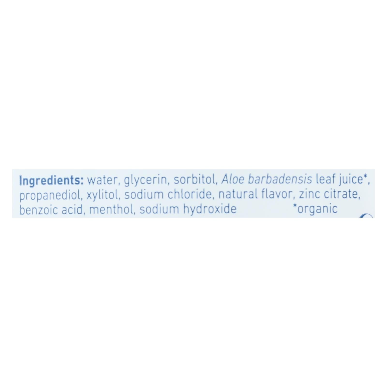 ingredients : water;glycerin;sorbitol;aloe barbadensis leaf juice;propanediol;xylitol;sodium chloride;natural flavor;zinc citrate;benzoic acid;menthol;sodium hydroxide